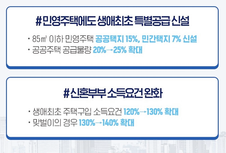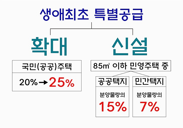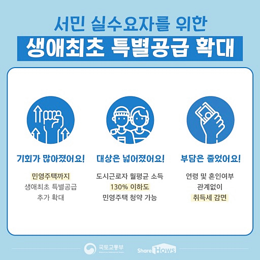 국토교통부는 지난 7.10 대책의 후속 조치인 청약제도 개선안을 통해 국민주택에만 적용되던 ‘생애최초 특별공급 제도’를 민영주택에도 도입해 공급량을 늘리겠다고 발표했다. 이에 따르면 민영주택 전용 85㎡ 이하에 한해 공공택지는 분양 물량의 15%, 민간택지는 7%를 생애최초 특별공급 물량으로 배정한다. 기존 20%였던 국민주택 생애최초 특별공급의 비율은 25%로 확대 적용된다.특히 민영주택의 경우 상대적으로 높은 분양가를 고려해 신청 자격 중 소득수준 부분을 도시근로자 월평균 소득의 130% 수준으로 완화하기로 했다. 3인 이하 가구 기준 722만원, 4인 가구 기준 809만원인 수요자도 청약이 가능한 것이다. 연령대에 상관없이 소득∙자산 기준을 맞추고 세대원 모두가 생애 처음으로 내 집 마련에 나서는 무주택자라면 누구나 청약할 수 있다.