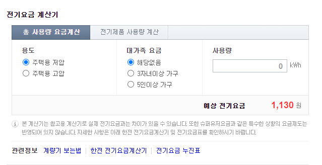 본 계산기는 참고용 계산기로 실제 전기요금과는 차이가 있을 수 있습니다. 또한 슈퍼유저요금과 같은 특수한 상황의 요금제도는 반영되어 있지 않습니다. 자세한 사항은 아래 한전 전기요금계산기 및 전기요금표를 확인하시기 바랍니다.