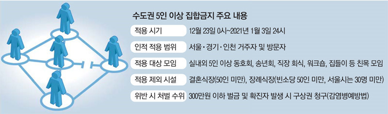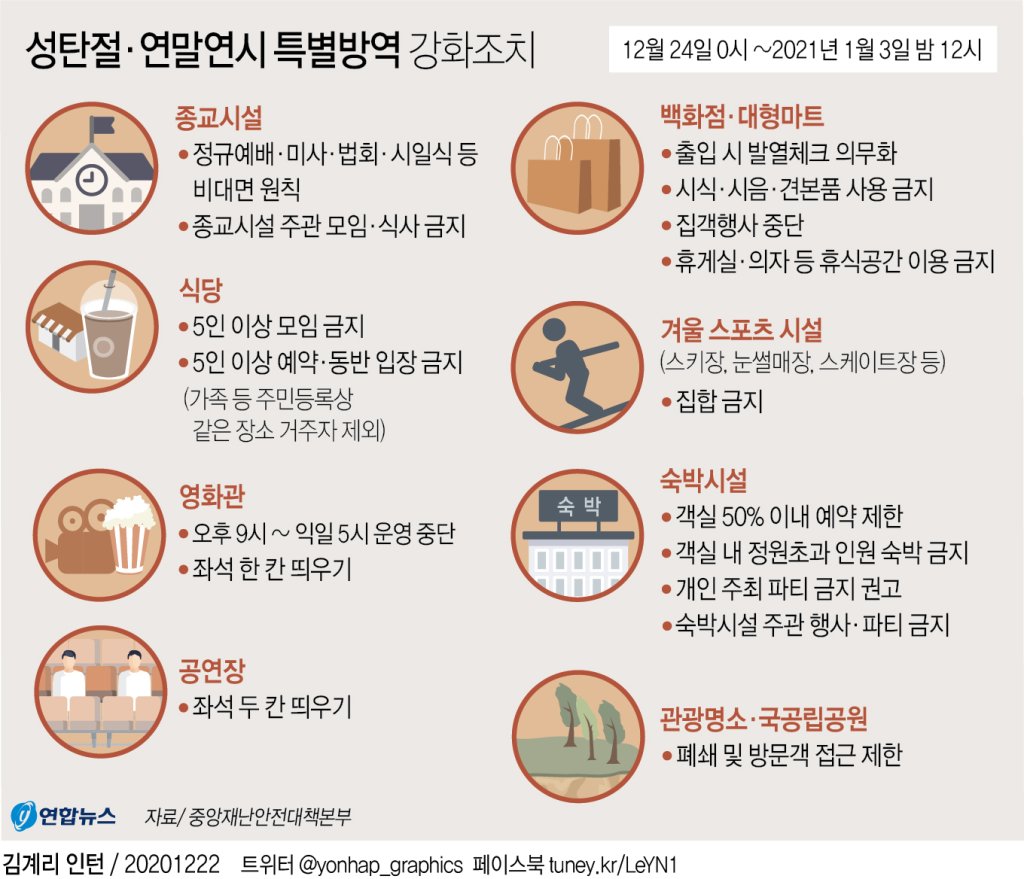 오는 24일 오전 0시부터 2021년 1월3일 밤 12시까지 전국 시도에서는 5인 이상 집합금지 및 다중이용시설 출입이 제한되는 '연말연시 특별방역 강화대책'이 실시된다. 특히 확산세가 큰 수도권에서는 하루 앞선 23일 0시부터 오는 1월3일까지 5인 이상 사적모임이 금지된다.