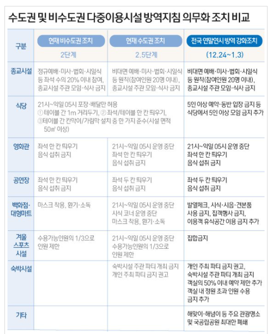 수도권에서는 23일부터, 비수도권에서는 24일부터 적용된다. 현재 수도권에만 적용되고 있는 종교시설 주관의 모임·식사 금지는 전국으로 확대 적용되고, 해맞이 등 주요관광명소와 스키장 방문은 금지된다.