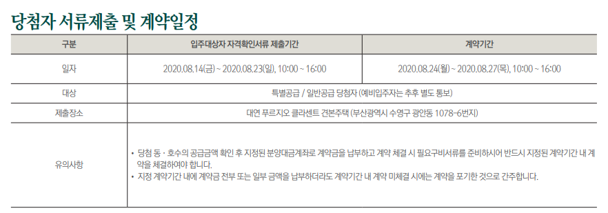 당첨자 서류제출 및 계약일정