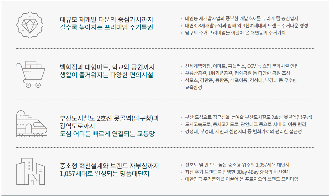 단지는 부산광역시 남구 대연동 1203-100번지 일원에 지하 4층~지상 36층 8개동, 전용면적 59~84㎡, 총 1057가구로 구성되며, 이 중 592가구가 일반 분양된다. 전용면적별로는 ▲59㎡ 154가구 ▲74㎡ 313가구 ▲84㎡ 125가구 등이다.