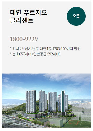 단지가 조성되는 부산 남구 대연동 일대는 대규모 재개발·재건축 정비사업이 활발하게 진행 중이다. 다른 지역의 따근한 신규 분양 단지는 아래에서 확인하세요. 프리미엄 상당할 것으로 예고되는 분양아파트 입니다.