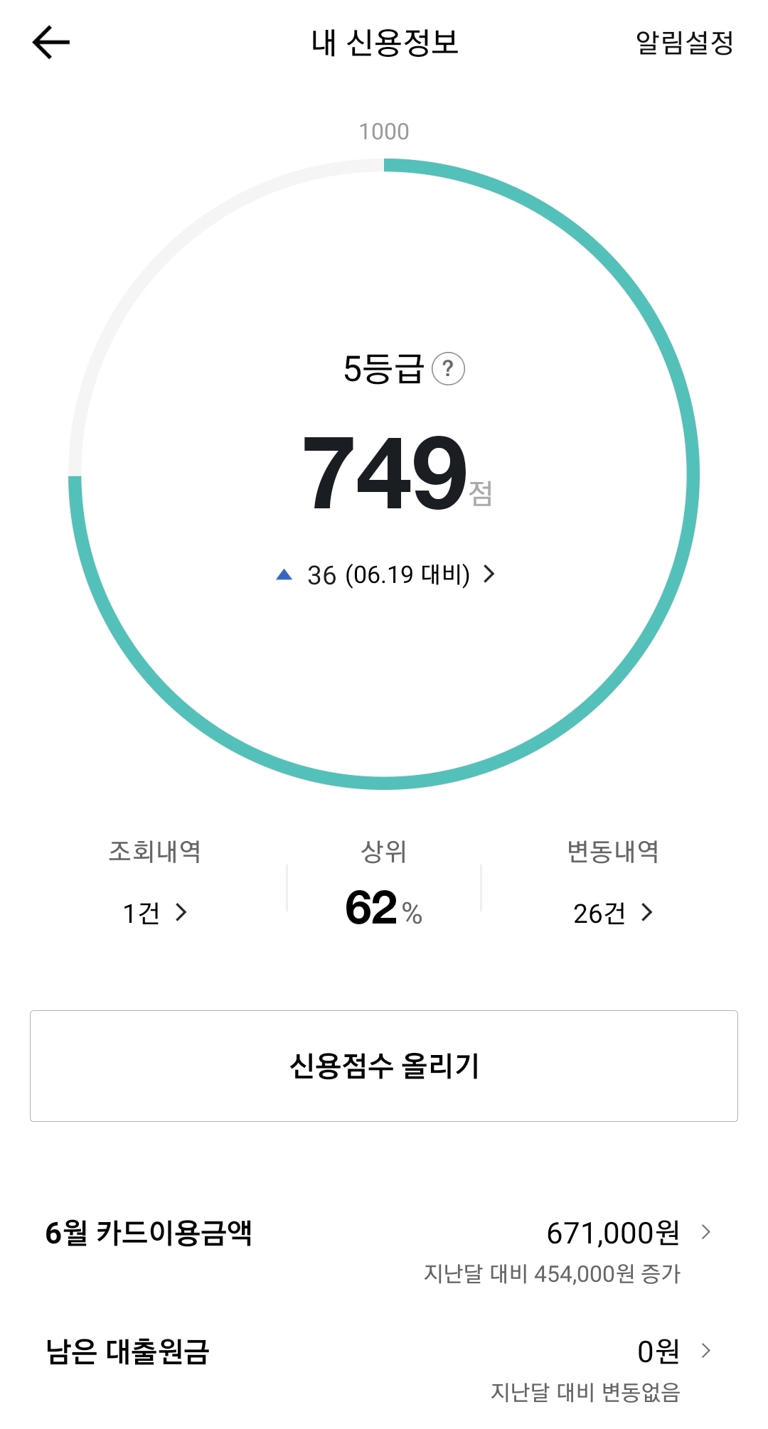 바로 확인할 수 있습니다. 카카오뱅크는 국내 신용평가사인 코리아크레딧뷰 KCB 와의 제휴를 통해 신용정보를 제공하고 있습니다. 749점이면 5등급으로 6.19일 대비 36점이 상승한 것으로 확인이 됩니다.