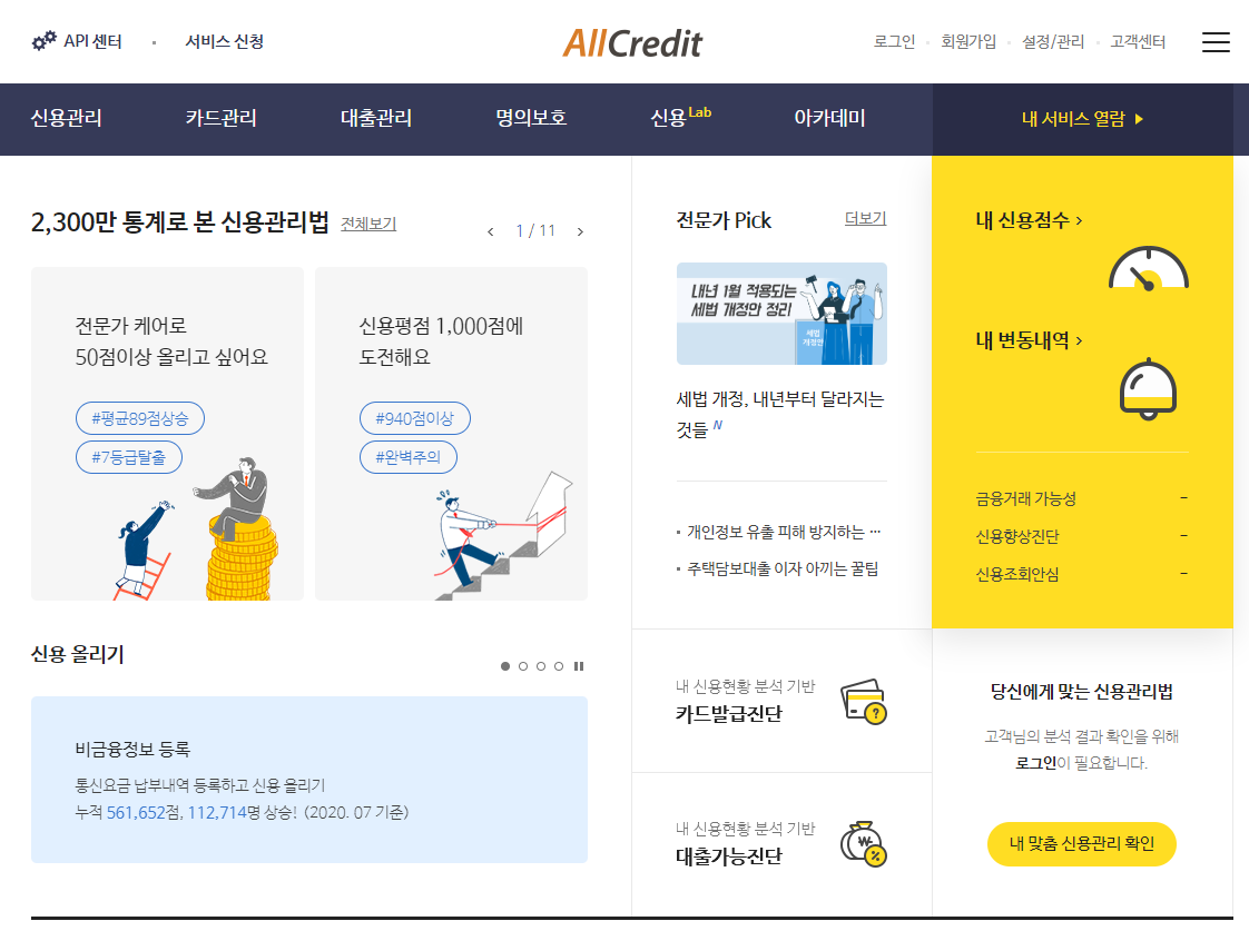 올크레딧에서는 금융기관용 개인신용등급조회, 신용평점 조회 및 신용관리, 신용점수 올리기가 가능합니다. 신용등급무료조회부터 카드, 대출이용현황, 연체내역 확인, 신용정보 변동알람, 등�