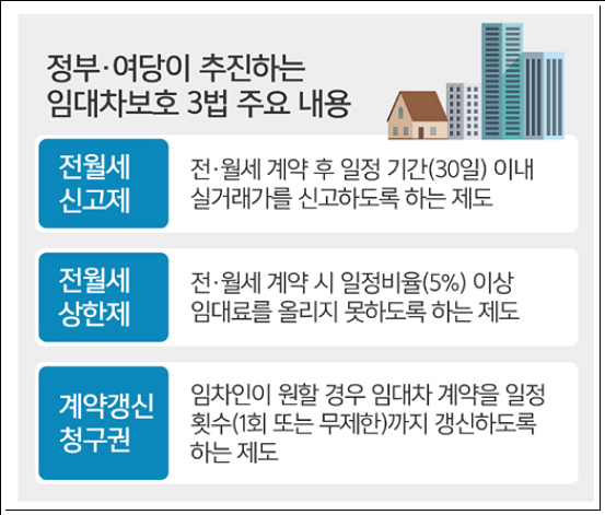 임대차 3법은 전월세신고제·전월세상한제·계약갱신청구권제 등을 핵심으로 하는 법안으로, 계약갱신청구권과 전월세상한제를 핵심으로 한 ‘주택임대차보호법’ 개정안과 전월세신고제를 핵심으로 한 '부동산 거래신고 등에 관한 법률' 개정안이 이에 포함된다. 해당 법안들은 각각 여당 의원들이 중심이 돼 2020년 6월과 7월에 국회에 발의됐으며, 향후 통과 여부가 주목되고 있다.