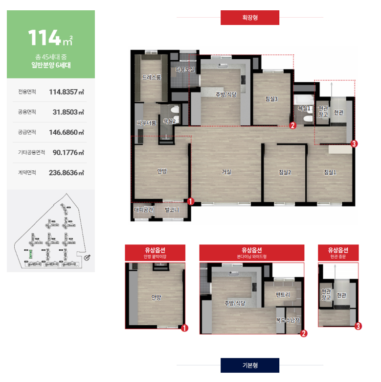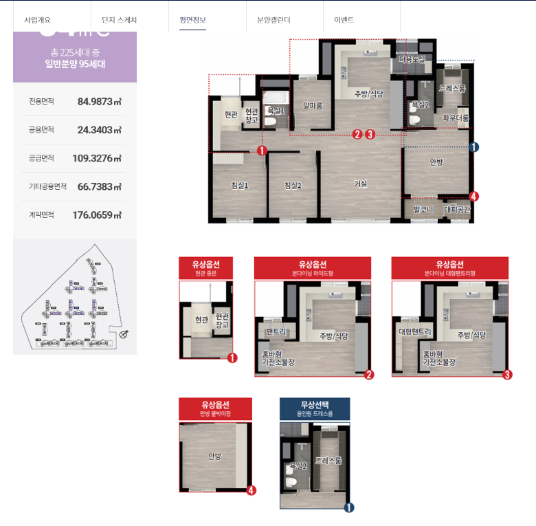 이 밖에도 전용 84㎡C 타입은 알파룸을 와이드다이닝과 팬트리가 함께 구성되는 구조(유상옵션)와 대형 팬트리와 주방장식장이 구성되는 구조(유상옵션)를 추가적으로 선택해 활용할 수 있게 했다.