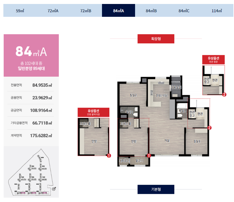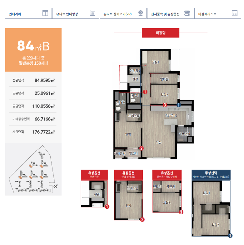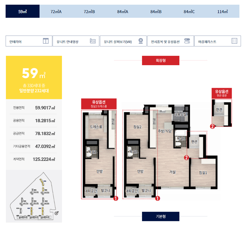 먼저 전용 59㎡ 타입의 경우 침실2를 시스템 드레스룸(유상옵션)으로 활용할 수 있게 했고, 전용 84㎡B 타입은 침실1·2 사이에 마련된 알파룸을 방안에 방이 또 하나 있는 룸인룸 형태(유상옵션)나 워크인 수납장(무상옵션) 형태로 선택할 수 있게 했다.