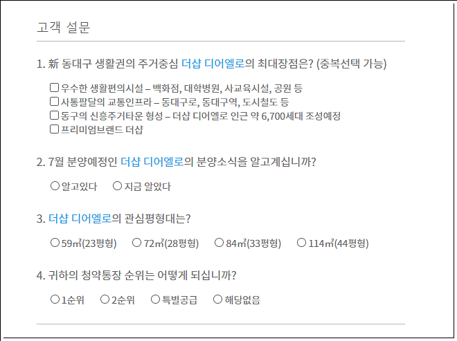 건설사에서 궁금한 것을 설문으로 돌려보는데요. 최대 장점. 그리고 분양소식을 알고 있는지. 그리고 관심 평형대. 그리고 청약에 임하실 분들의 청약통장 순위를 물어보고 있습니다.