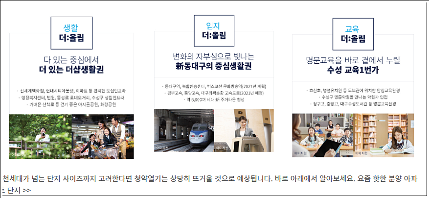 이미 동구지역의 이시아폴리스에서 검증받은 포스코건설의 더샵 브랜드이다. 1천세대가 넘는 단지 사이즈까지 고려한다면 청약열기는 상당히 뜨거울 것으로 예상됩니다. 바로 아래에서 알아보세요. 요즘 핫한 분양 아파트 단지 >>