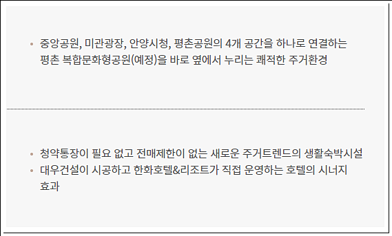 또한 양도세 및 보유세 중과 대상도 아니며, 특히 전매제한이 없어 당첨 후 바로 전매가 가능하다. 단지는 생활숙박시설로 조성되는 만큼 ‘주택법’이 아닌 ‘건축법’을 적용받아 다양한 규제로부터 자유로운 것이 특징이다.