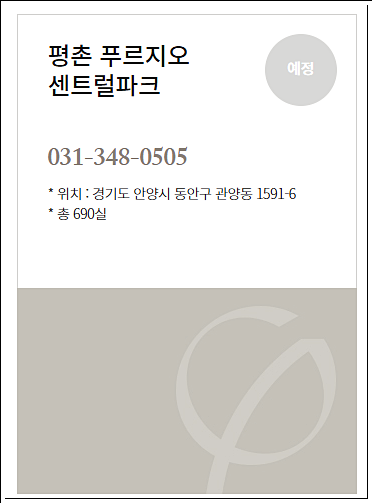 한편 평촌 푸르지오 센트럴파크 견본주택은 안양시 동안구 관양동 919번지에 마련된다. 7월 오픈 예정이며, 생활숙박시설과 상업시설 동시분양 예정이다.