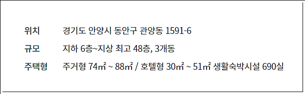평촌 푸르지오 센트럴파크는 안양시 동안구 관양동 1591-6번지 일원에 지하 6층~지상 최고 48층, 3개 동, 총 690실 규모의 생활숙박시설로 조성된다. 주거형 생활숙박시설 552실과 호텔형 생활숙박시설 138실로 구성되며, 지상 1~2층에는 상업시설이 함께 구성된다.
