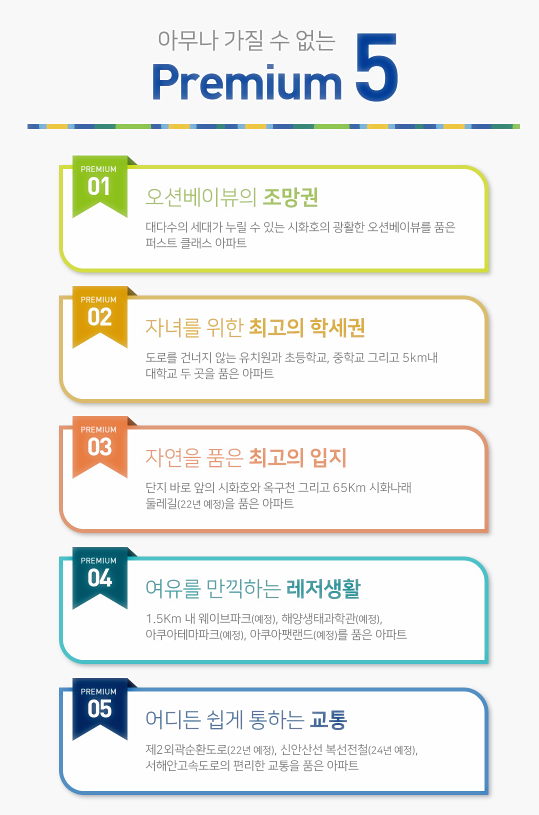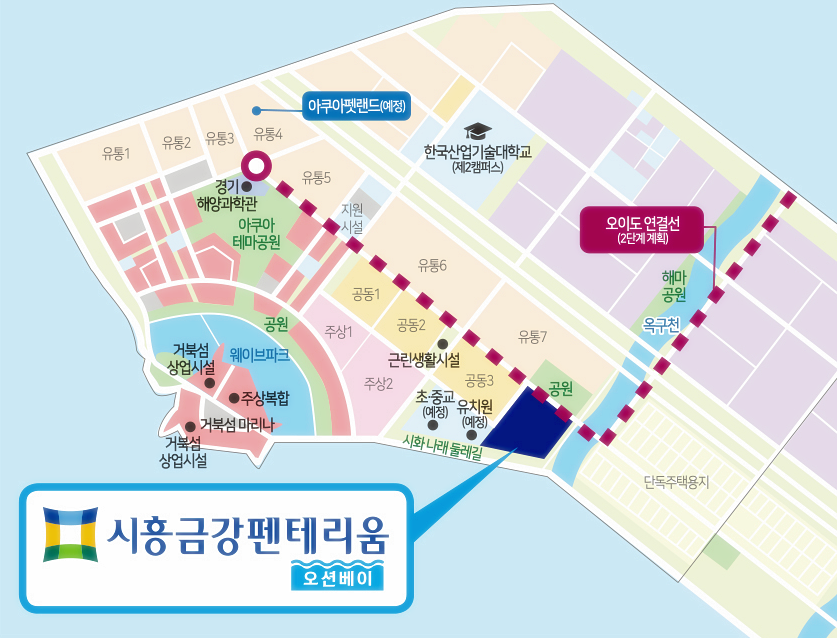 시화 MTV는 수도권 남부의 새로운 첨단복합산업단지이자 해양 레저 산업의 중심지로 조성되고 있는 신도시이어서 시흥 금강펜테리움 오션베이는 다양한 생활 인프라를 도시 내에서 즐길 수 있다.