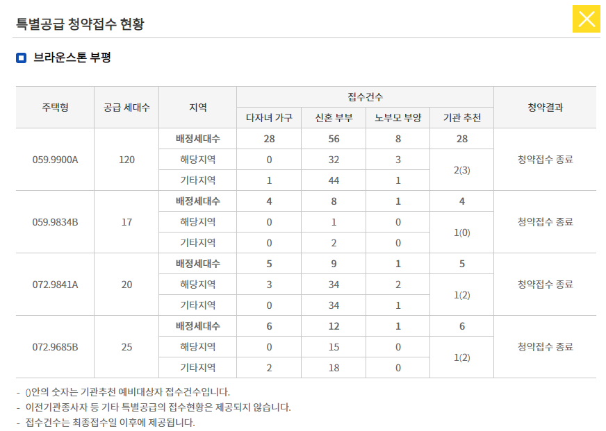 이수건설이 인천시 부평구 삼산동 일원에 분양 중인 ‘브라운스톤 부평’의 전용 59㎡형 등 일부 주택형이 지역 1순위 청약에서 미달된 것으로 보입니다. 30일 청약홈에 따르면 이 단지의 특별공급에서 모두 182가구 모집에 37가구가 미달되면서 소진율이 79%를 기록했다. 요즘 핫한 다른 지역 분양단지 따끈한 정보는 아래에 있습니다.