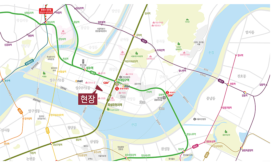 지하철 2,7호선 건대입구역과 7호선 뚝섬유원지역이 도보권에 있고, 강변북로, 영동대교, 청담대교, 올림픽대로 등의 도로를 통한 강남권으로의 이동도 수월하다.
