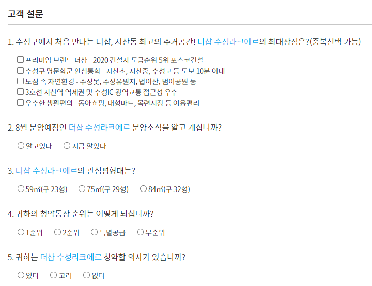 아래는 분양건설사에서 준비한 설문입니다. 수요 예측을 해볼 수 있는 대목이죠.
