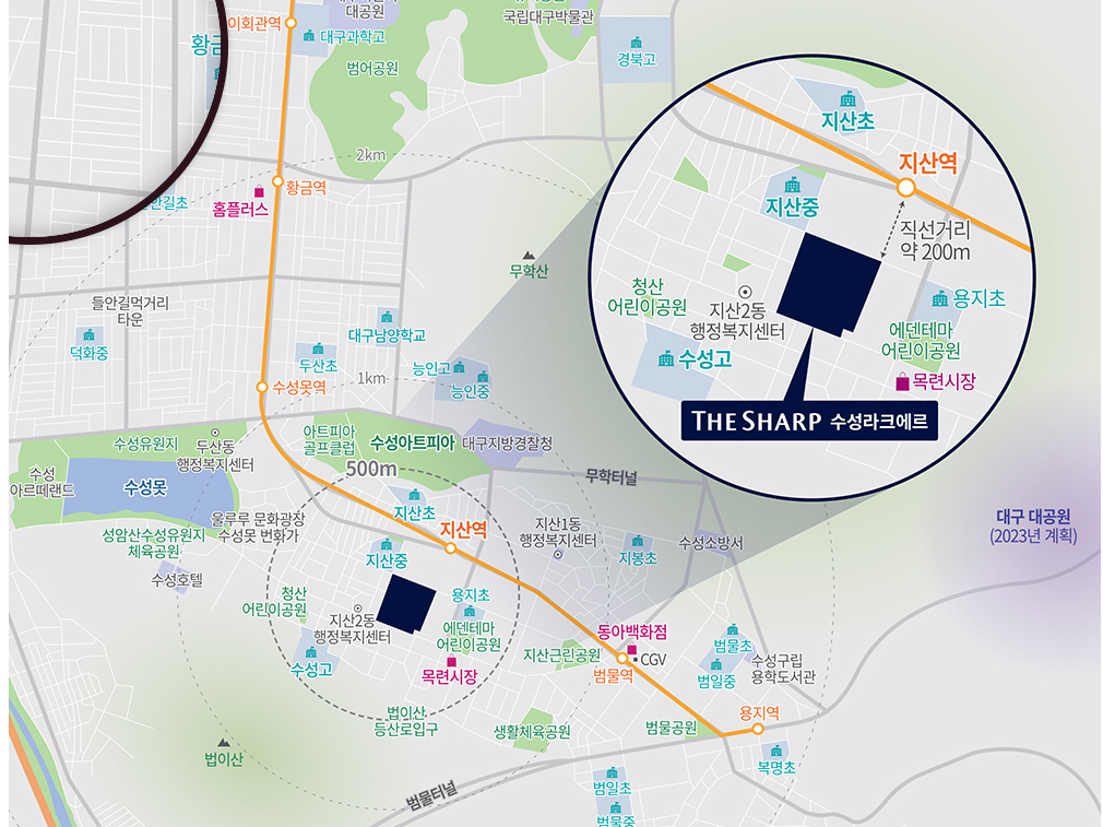 ‘더샵 수성라크에르’는 편리한 교통여건과 우수한 교육환경 그리고 각종 생활 편의시설 등 뛰어난 입지를 자랑한다.