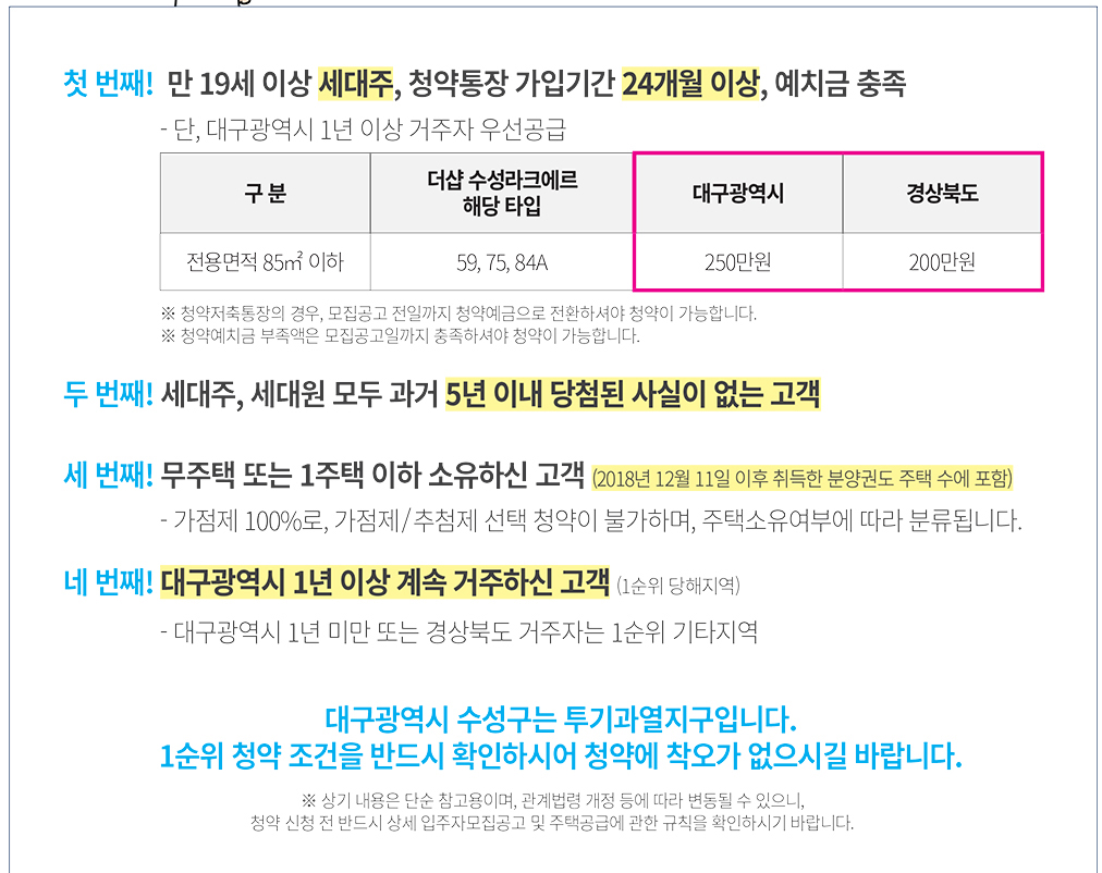 가점제 100% 운영하고, 거주는 대구광역시, 경북 거주자 우선입니다. 해당지역 1순위에서 마감이 되지 않을까 기대됩니다. 기타지역 1순위 2순위 자들에게는 큰 의미가 없어 보입니다.