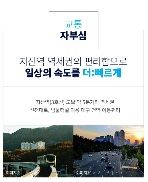 도보로 5분이면 대구도시철도 3호선 지산역을 이용할 수 있는 역세권 단지이며 수성IC가 인접해 대구 전역은 물론 외곽지역으로도 이동이 편리하다. 대구지하철 3호선의 연장선이 추진되고 있어 교통 여건은 더욱 향상될 전망이다.