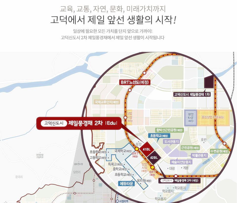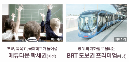단지가 들어서는 고덕신도시 에듀타운(예정)은 국제학교와 특목고를 비롯해 유치원, 초, 중, 고등학교까지 들어설 예정인 교육 특화 구역이다.