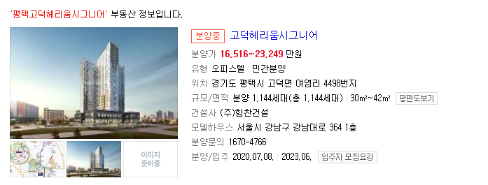 힘찬건설이 경기 평택시 고덕국제신도시에 ‘고덕 헤리움 시그니어’를 선보인다. 고덕 국제화지구 업무용지 11-1-1블록에 위치한 이 오피스텔은 지하 5층, 지상 24층 규모로 전용 20~28㎡ 1144실을 공급한다.