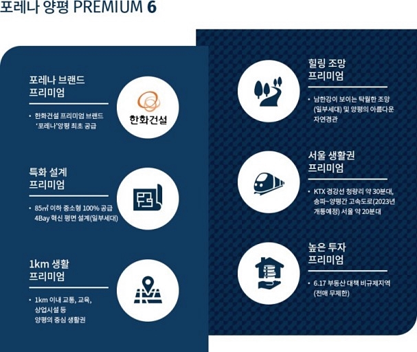비규제지역인 경기도 양평에 첫 진출하는 한화건설은 프리미엄 주거 브랜드 포레나를 앞세워 9월 공급에 나설 예정이다. 양평읍 창대리 일대에 조성된 도시개발구역에서 중·소형 아파트로 구성된 '포레나 양평' 438가구로 타입별로는 59㎡ 171가구, 74㎡ 178가구, 84㎡ 89가구로 이뤄진다.