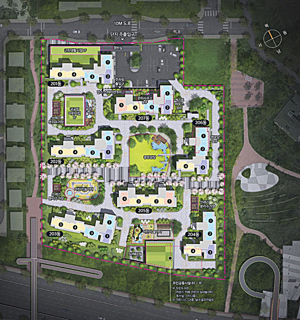 단지 내 커뮤니티시설로는 피트니스, 스크린골프타석, 라운지카페(작은도서관), 실내놀이터, 독서실, 어린이집, 경로당 등이 계획돼 있다. 재택근무가 필요한 입주민들과 학생들을 고려한 공유오피스겸 스터디룸과 마송택지지구 최초의 게스트 하우스가 들어설 예정이다. 또, 자녀들의 안전한 통학차량 탑승을 위한 단지 내 회차 공간 및 실내형 맘스스테이션 등 입주자 편의를 고려한 다양한 시설을 제공한다.