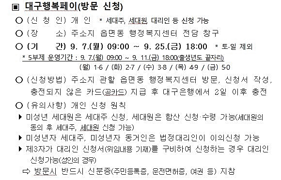 대구행복페이로 받고 싶다면 9월 7~25일 오후 6시까지 주소지 관할 행정복지센터에 방문 신청한 뒤 '공카드'를 지급받아 사용하면 된다.