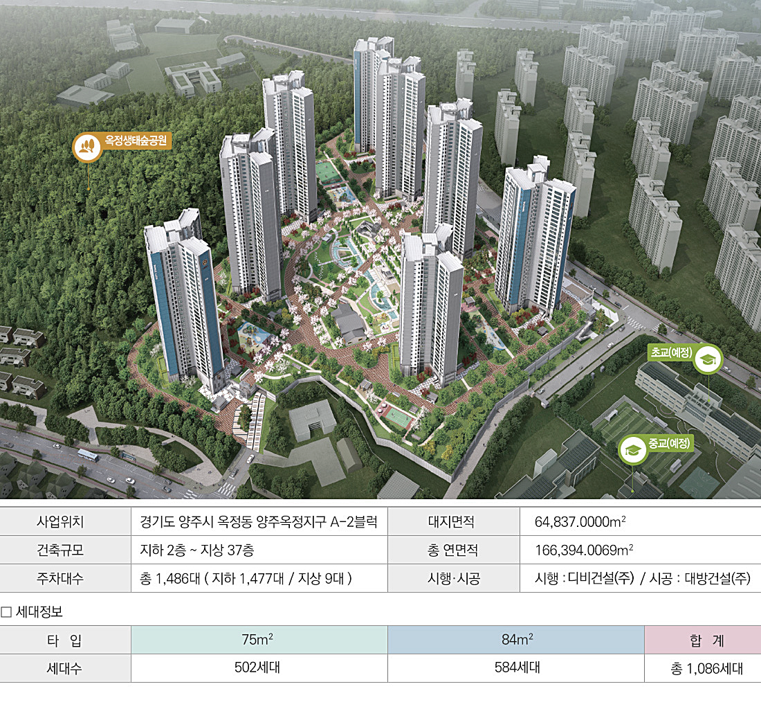 단지는 경기도 양주시 옥정동에 들어서며, 지하 2층 ~ 지상 최고 37층, 총 8개동, 전용면적 △75㎡ 502세대 △84㎡ 584세대 전체 1,086가구로 중소형평형대로 구성된다.