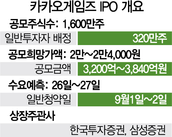 카카오게임즈는 27일 기관투자가 대상 수요예측을 마무리했다. 전체 공모주식 수 1,600만주 중 기관에 배정된 1,127만7,912주에 대한 청약 절차다. 수요예측 결과를 종합해 공모가를 최종 산정한 뒤 다음달 1~2일 일반투자자 대상 청약을 진행할 계획이다. 상장주관사는 삼성증권(016360)과 한국투자증권이다.