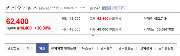 이날 오전 9시 19분 현재 코스닥시장에서 카카오게임즈는 시초가 4만8천원 대비 가격제한폭(30.00%)까지 치솟은 6만2천400원에 거래 중이다. 이렇게 올라도 공모주 많이 받으신 개미들이 없기에 큰 수익은 큰 손들의 몫입니다.